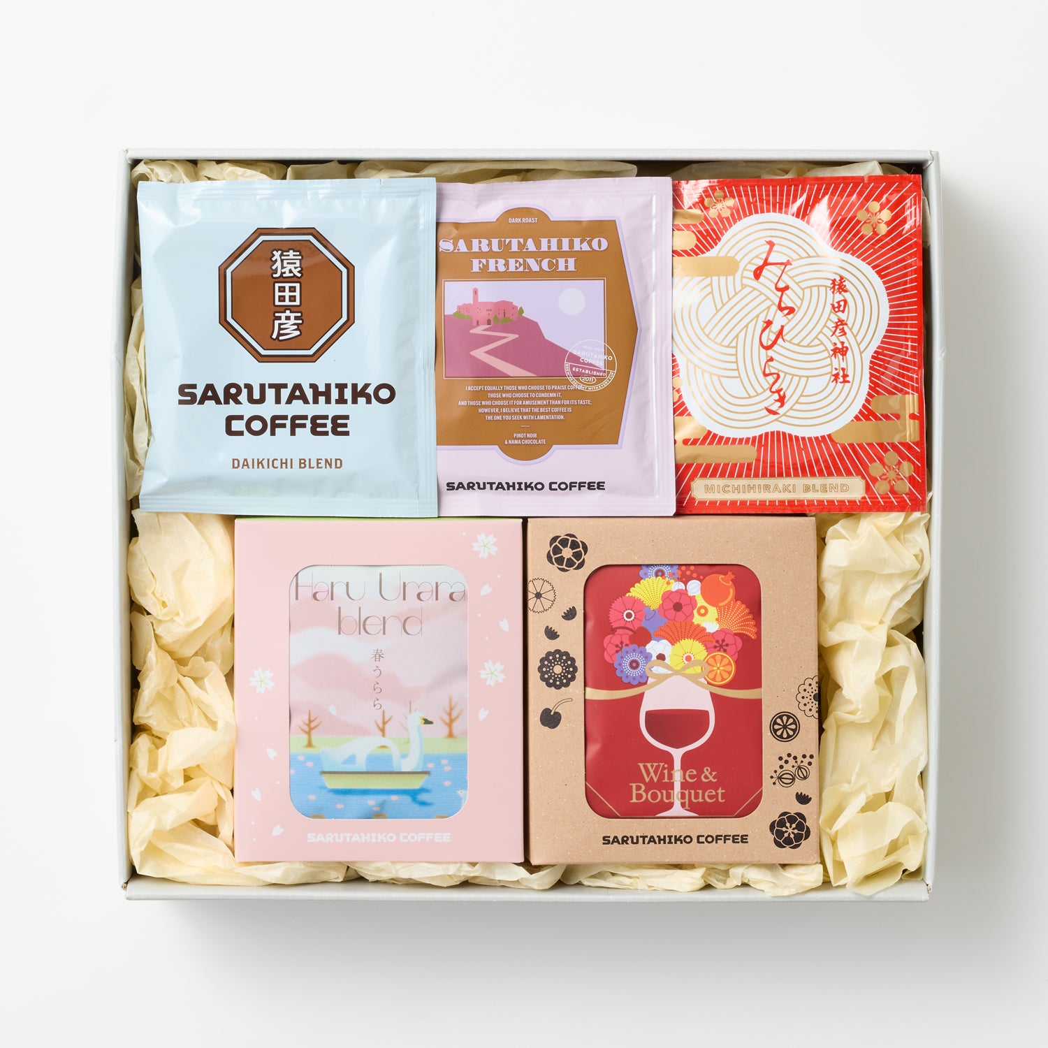 定番のドリップバッグ4種類と季節の【春うららブレンド】を詰め合わせた色々なお味を楽しめるドリップバッグのギフトです。