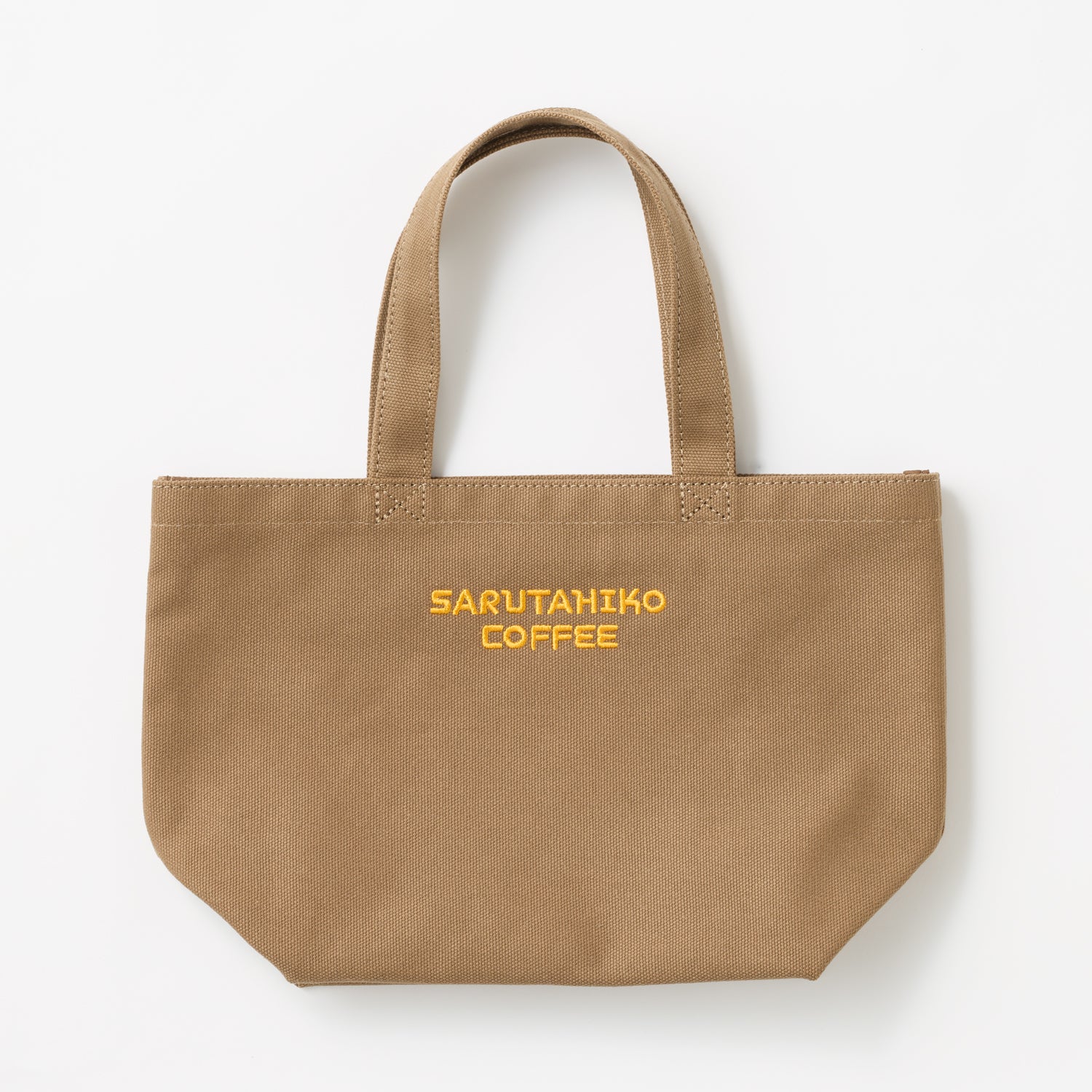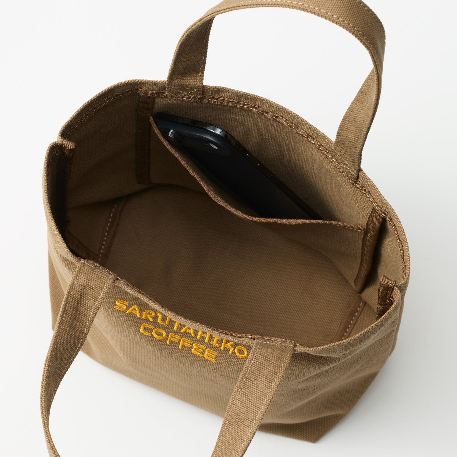 落ち着いたカラーのバッグに、ロゴをあしらったシンプルなデザインです。